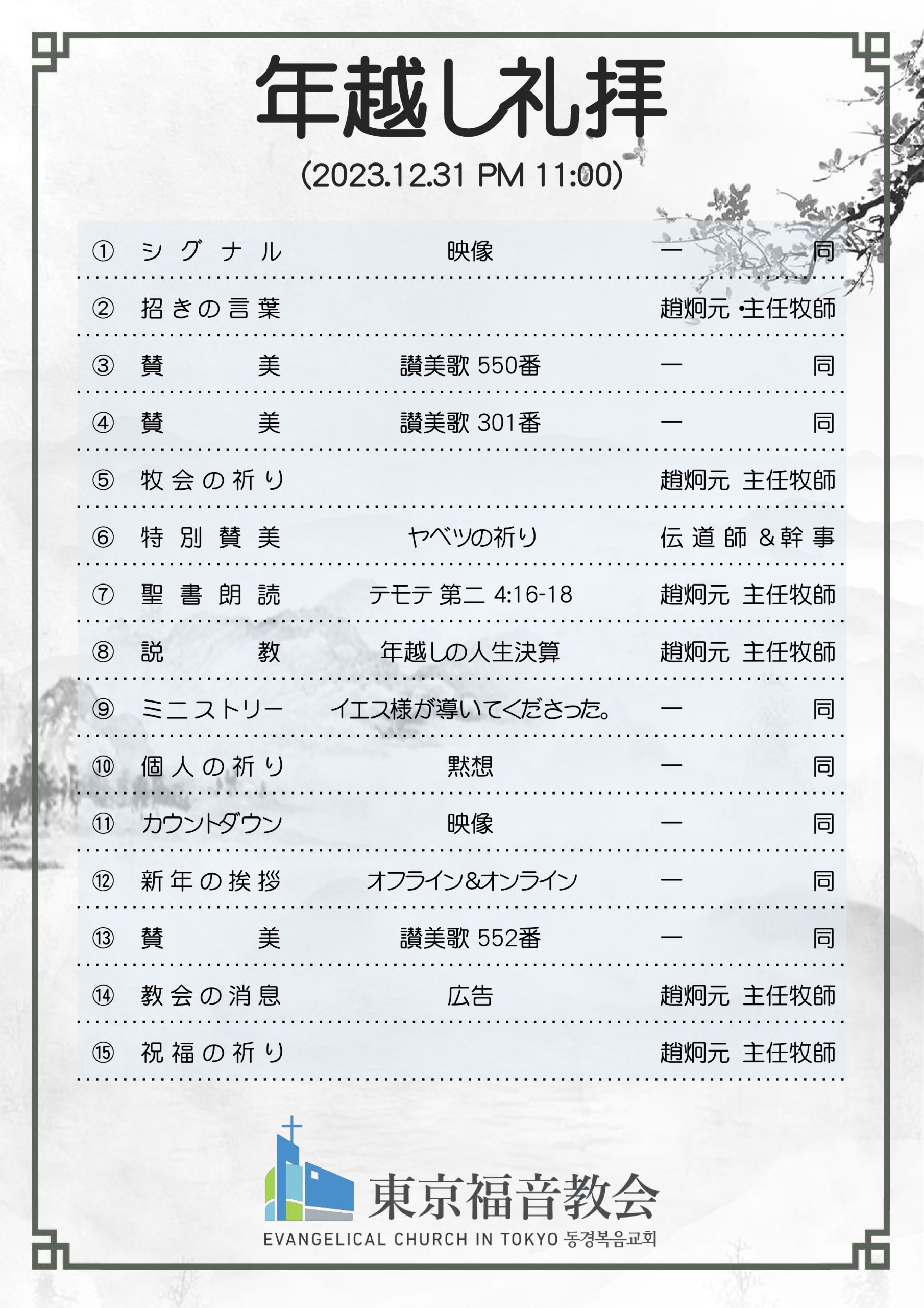 Dec312022eventCategory: eventBy ect19242022年12月31日 Author: ect1924 Post navigationPreviousPrevious post:2022.12.25 PM 5:00 CHRISTMAS FESTIVALNextNext post:2023.01.01 매일성경 본문 1월 2월Related Posts2024.03.31 졸업진급예배2024年3月9日2024.03.31 세례식 성찬식2024年3月9日2024.03.31 부활절 연합예배2024年3月9日2024.03.29 성금요기도회2024年3月9日2024 사순절2024年3月9日2024.01.07 신년감사 주일예배2023年12月28日