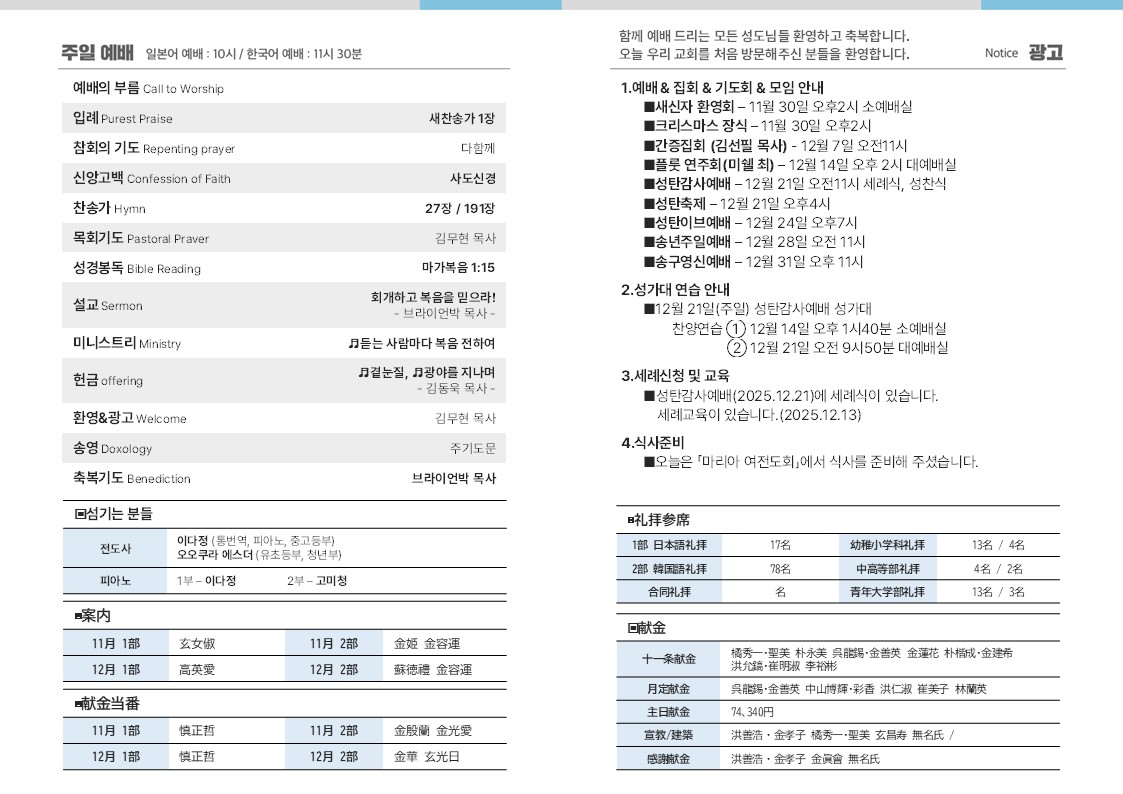2025.11.30 주보(週報) 합동예배(合同礼拝) 브라이언박 목사님 & 김동욱 목사님