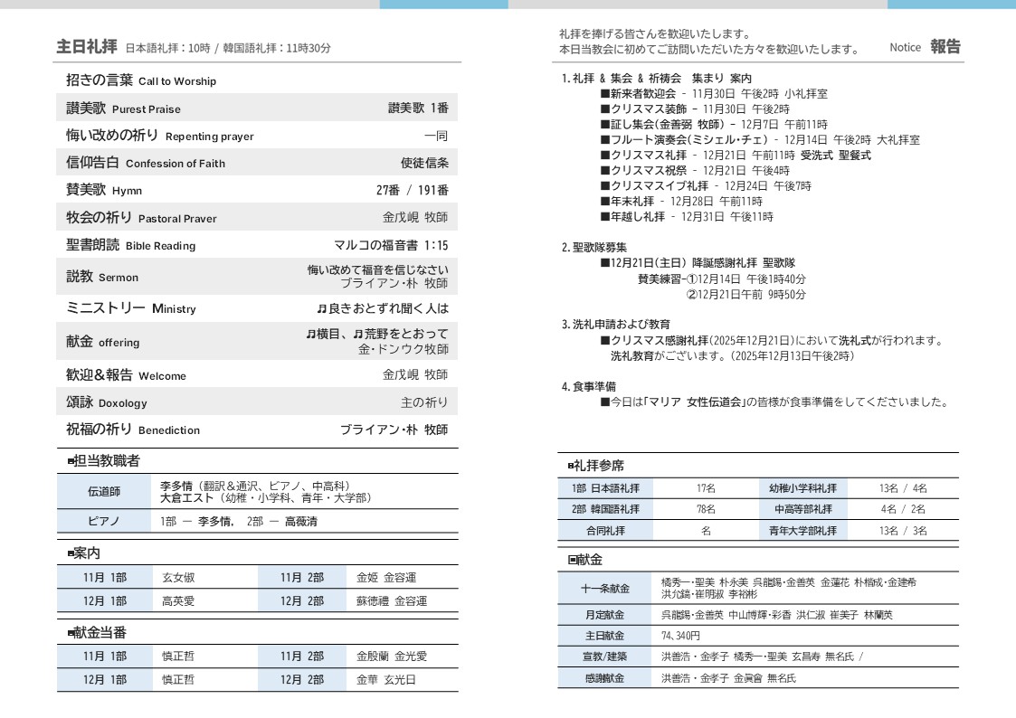 New 2025.11.30 주보(週報) 합동예배(合同礼拝) 브라이언박 목사님 & 김동욱 목사님
