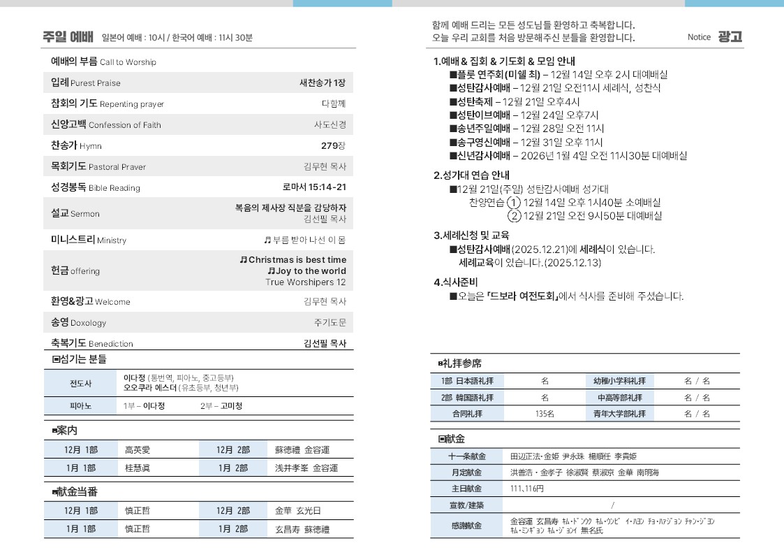 2025.12.07 주보(週報) 합동예배(合同礼拝) 김선필 목사님 & 김신현 형제님