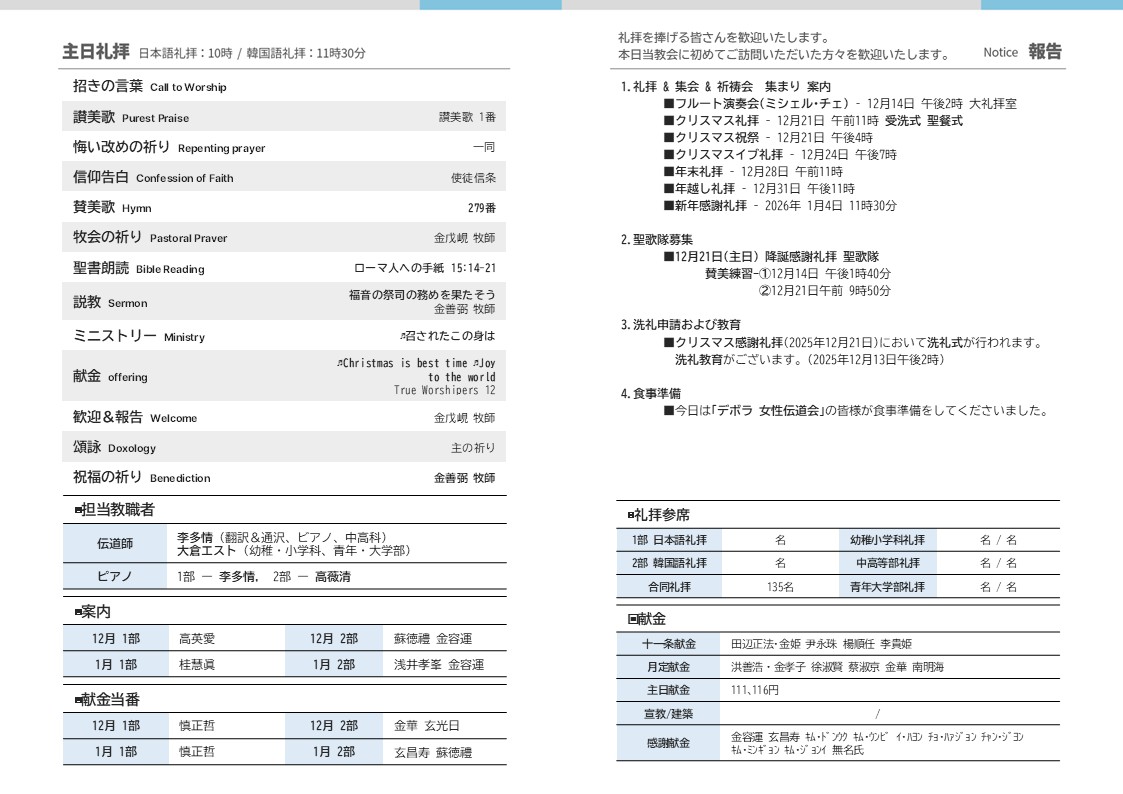 2025.12.21 주보(週報) 성탄감사예배(降誕感謝礼拝) 受洗式&聖餐式