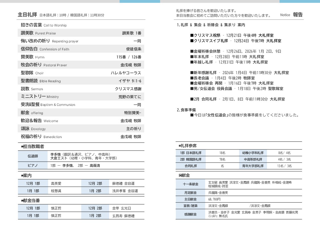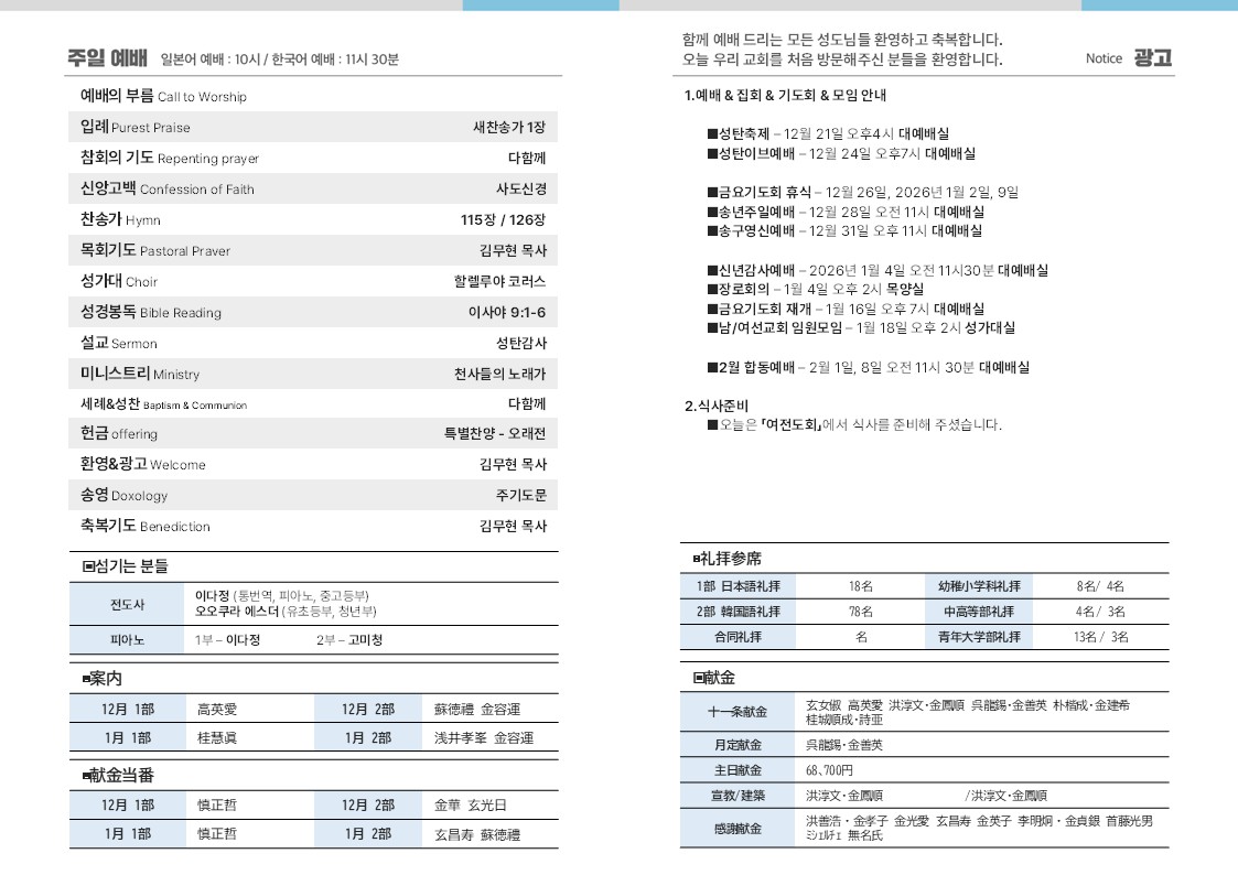 2025.12.21 주보(週報) 성탄감사예배(降誕感謝礼拝) 受洗式&聖餐式